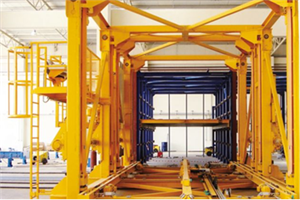 为了最充分利用车间面积和空间,底模托盘叠放在养护室内的搁架上。堆垛机把托盘运送到养护所需的架层,推进养护室;养护结束后再拉出养护室。根据生产线的设计,可以配备不同类型的堆垛机,以适应不同的需求。养护室也可以选配相应的供热系统。
